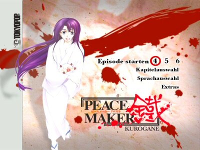 Die DVD wartet auch noch mit diversen Extras auf: Hier findet man "Mehr über Okita", eine Galerie (diese zeigt einige Skizzen zum Anime, abgespielt als ein mit dem Opening unterlegter Clip), textless Opening und Ending, drei TV-Spots (alle auf Japanisch ohne Untertitel), deutsche Credits und Verweise auf den Peace Maker Kurogane Manga und die Internetseite von Tokyopop.