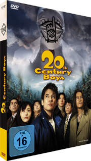 „20th Century Boys“ wird in einer stabilen, dreiseitigen Kartonverpackung zum Aufklappen geliefert. Die Seiten sind mit Screenshots aus dem Film bedruckt und im Innenteil befindet sich ein Einsatz aus Plastik, in dem die DVD befestigt ist. Auf dem Cover sind Kenji und seine Freunde vor einer brennenden Skyline abgebildet; über ihnen schaut der „Freund“ drohend vom Himmel auf sie herab. Genau zwischen dem Himmel und der Gruppe von Freunden ist der gelbe Titel-Schriftzug wie eine Trennlinie angebracht und ganz klein in der rechten unteren Ecke prangt der Name des Publishers. Weniger dezent ist hingegen das blaue FSK 16 Logo gegenüber in der linken Ecke. Die Rückseite ist recht bunt gehalten und versorgt den Zuschauer mit einer Inhaltsangabe, technischen und rechtlichen Daten sowie ein paar kleinen Screenshots.