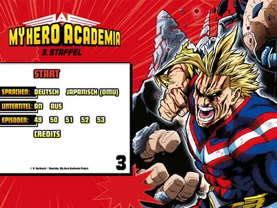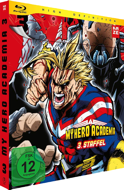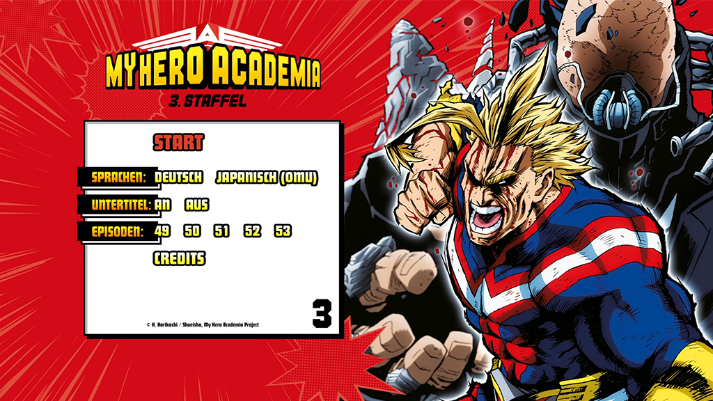 Für diese Volume wurde ein blutiges Rot gewählt, mit All Might und All For One auf dem Cover. Klappt man die Hülle auf, liegt links üblicherweise das Fach mit den Extras und rechts die Blu-ray. Hebt man diese vorsichtig heraus, kommen darunter auch noch mal bunte Szenen aus dem Anime hervor, die mit Balken im Comicstil schon Vorfreude erzeugen.