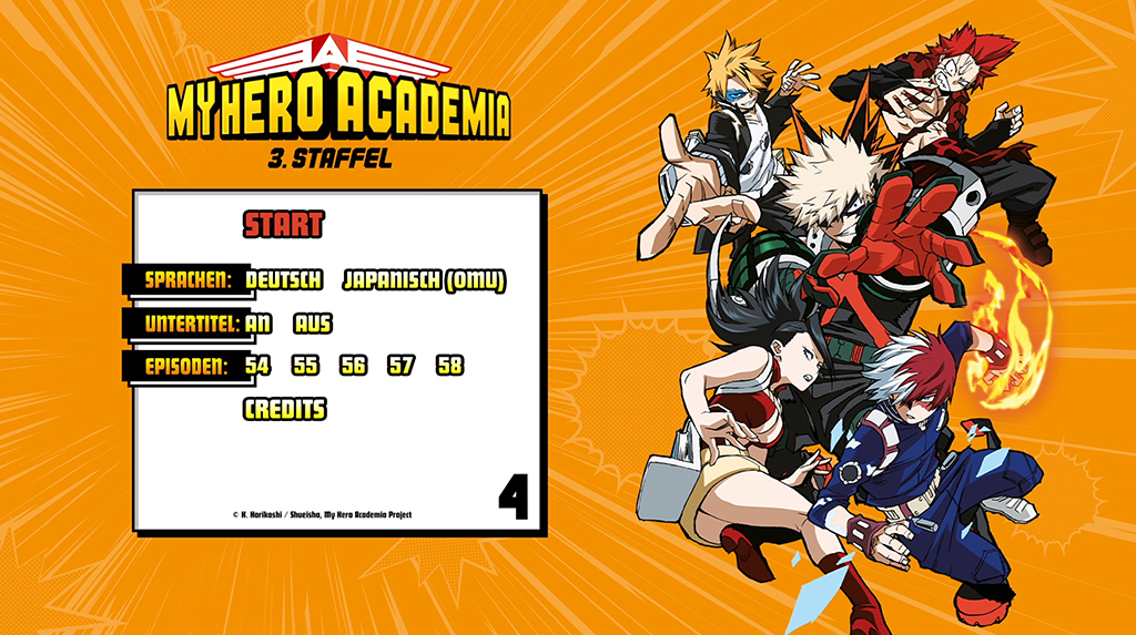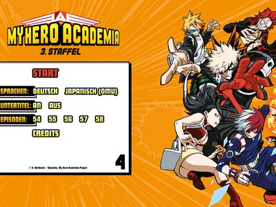 Für diese Volume wurde ein sommerliches Orange gewählt, mit den Studenten Denki, Enjiro, Katsuki, Shoto und Momo auf dem Cover. Klappt man die Hülle auf, liegt links üblicherweise das Fach mit den Extras und rechts die Blu-ray. Hebt man diese vorsichtig heraus, kommen darunter auch noch mal bunte Szenen aus dem Anime hervor, die mit Balken im Comicstil schon Vorfreude erzeugen.