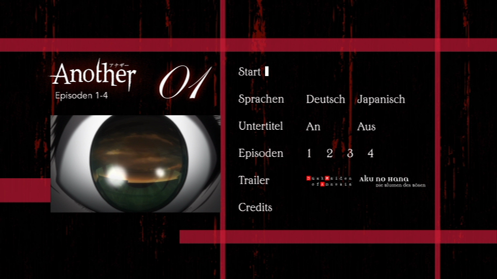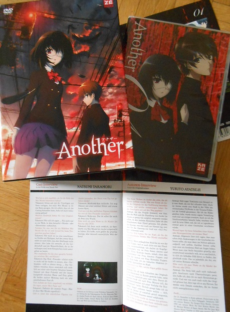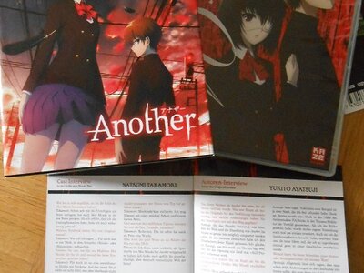 Bei der Limited Edition von „Another Volume 1“ ist, wie bei Kazé Anime beinahe schon Standard, ein stabiler Sammelschuber mit zwei Hochglanzbildern auf beiden Seiten dabei. Im Gegensatz zu den beiden Covern auf dem Schuber, ist das Inlay der ersten DVD verhältnismäßig einfach gehalten. Lediglich die zwei Hauptfiguren sind auf einem rot-schwarzen Hintergrund zu sehen.