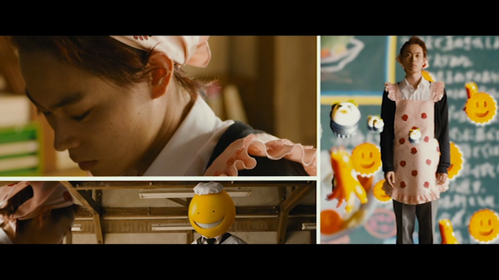 Die Figur des Aliens, also Koro-sensei, wurde wirklich sehr gut umgesetzt und passt einwandfrei in die Szenen, als wäre er Wirklichkeit und lebendig. Auch die Kulissen und meisten Charaktere wurden sehr akkurat gestaltet. Nur die meisten Haarfarben halten sich im normalen Bereich.