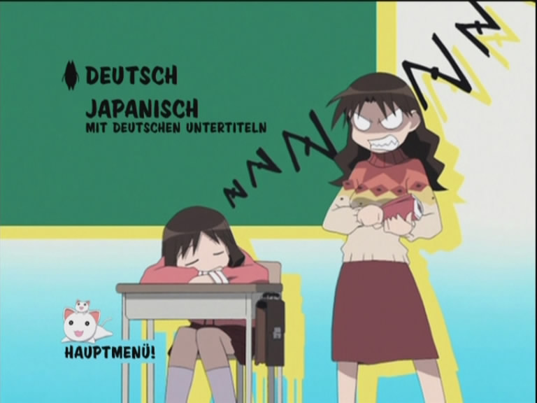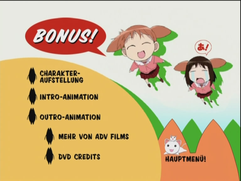 Hinter dem Bonusmaterial verbergen sich eine Charakteraufstellung, eine creditless Intro und Outro Animation und sowohl die DVD Credits als auch ein Punkt "Mehr von ADV Films", der Trailer zu anderen DVDs von ADV beinhaltet. Darüber fliegen Chiyo-chan und Osaka.