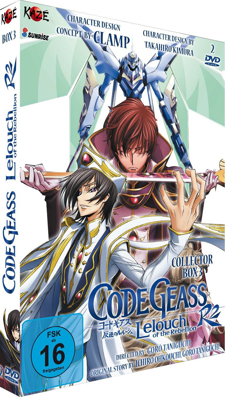 Erneut begegnet uns die Verpackung in der schön gestalteten weißen Hülle. Dieses Mal prangern sowohl Lelouch in herrschsüchtiger Pose sowie auch Susaku mit einem Schwert in den Armen auf dem Cover. Im Hintergrund baut sich derweil der Knightmare Frame von Susaku auf. Neben dem weniger schönen, aber unvermeidlichen FSK Logo sticht der in Königsblau glänzender Schrift gehaltene Titel ins Auge.