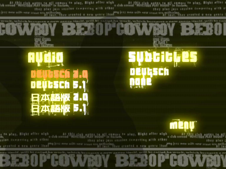Bei den DVD-Hüllen hat jede ihr eigenes Cover und Farbe, beginnend bei Spike, Faye, Jet, Ed, Ein, Vicious, und zwei Gemeinschaftsbilder auf den DVDs 8 & 9. Auf den DVDs 1-7 lassen sich die 26 Episoden finden, auf den DVDs 8 & 9 reines Bonusmaterial.