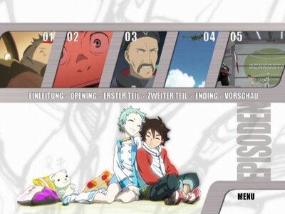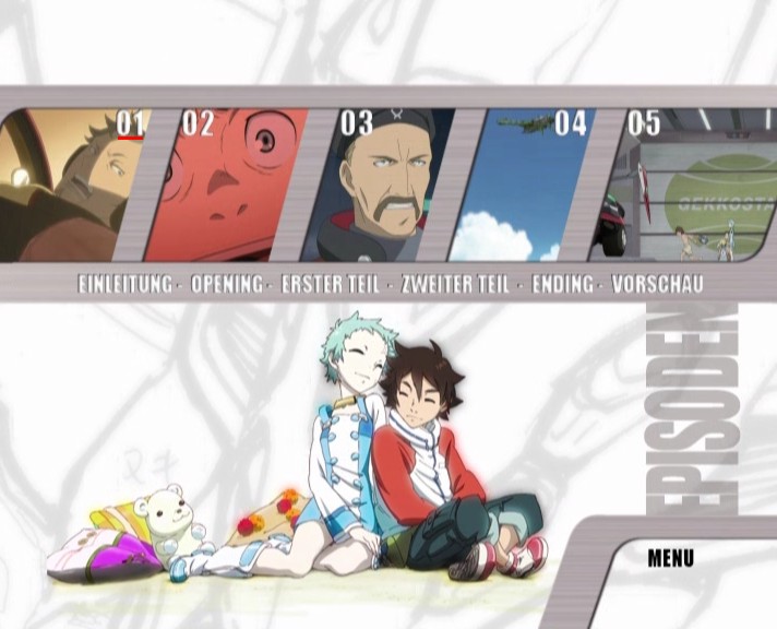 Geliefert wird die erste DVD der neuen Anime-Serie in einer handelsüblichen weißen Amaray-Box. Die Covergestaltung wurde durch Kenichi Yoshida realisiert und zeigt Renton in einer etwas schräg gestellten Illustration. Neben dem Titel der Serie befinden sich auch noch vier eindrucksvolle Screenshots am unteren Rand, während sich ein kurzer Einleitungstext am linken Rand, sowie auf der Rückseite in einem grauen Kästchen hervorhebt. Des Weiteren finden wir einen großen und vier etwas kleinere Screenshots auf der Rückseite, die sich neben den Beschreibungen zu den fünf enthaltenen Episoden anordnen. Technische Angaben und Extras kann man hier ebenfalls nachlesen. Der Verpackung selbst liegt ein kleines 6-seitiges Booklet mit einigen interessanten Fakten bei. Ein Programmheft von beez Entertainment fehlt jedoch.