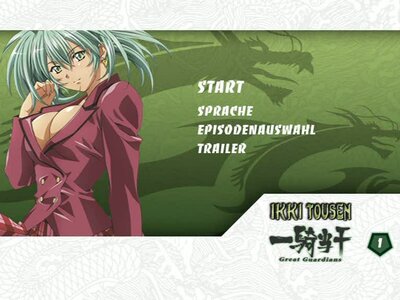 Neben dem Wende-Cover, welches das gleiche Bild nur ohne das große FSK Logo zeigt und dem Schuber, der bei der limited Edition dabei ist, bietet „Ikki Tousen – Great Guardians“ auch noch andere Extras. In der Hülle der DVD liegen zwei Postkarten bei. Beide sind glänzend und stabil. Sie zeigen jeweils Ryomo und Hakufu in aufreizenden Posen. Außerdem findet sich ein vier Seiten „starkes“ Booklet, von dem die erste und die vierte Seite jedoch mehr als Einband gelten. Es zeigt Ryofu und das Logo der Serie, alles in Grün und Weiß auf schwarzem Hintergrund gehalten. Interessant ist die längliche Form des Booklets und dass es sich nach oben hin aufklappen lässt. Hier findet man nun auf der oberen Seite Informationen zu Sonken Chubo, Hakufus kleiner Schwester, während Ryomo und Ryofu sich die untere Seite teilen. Steht bei Chubo noch einiges an Text, wurde bei den anderen beiden darauf verzichtet. Geziert wird das Ganze durch Screenshots und Zeichnungen aus den Charakter-Sheets der Charaktere.