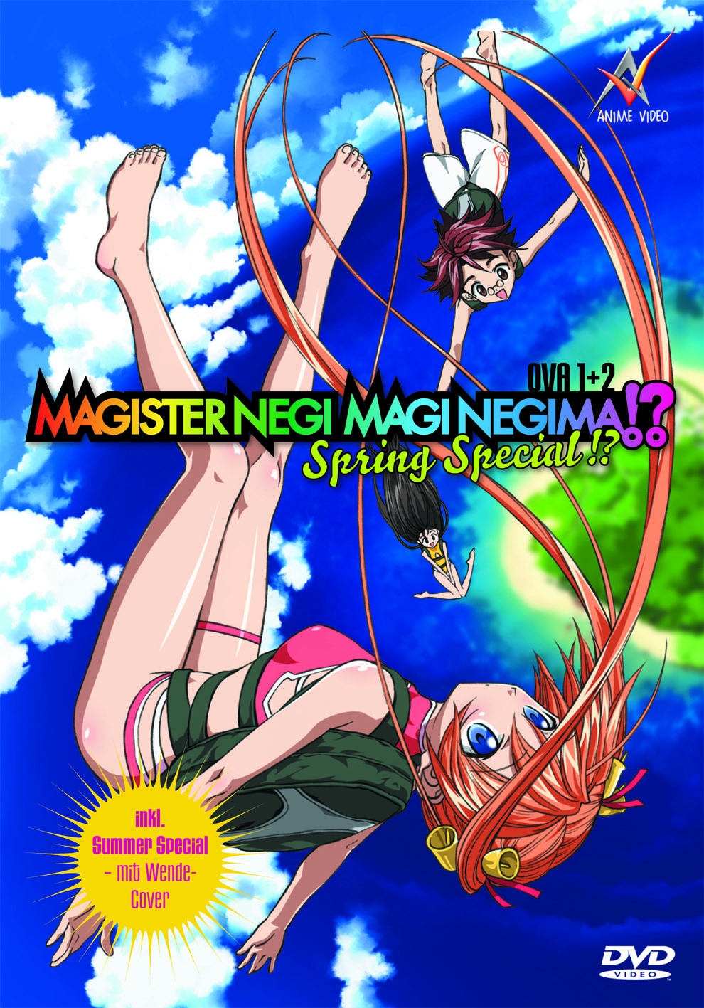 Verpackt ist die DVD in einer ganz herkömmlichen DVD Hülle. Auf dem Cover sieht man Negi, Asuna und Konoka während dem Flug aus dem Flugzeug auf die kleine Insel. Mittig ist der schöne, bunte Schriftzug „Magister Negi Magi Negima!? Spring Special“ zu erkennen. Ein Hinweis in der unteren Ecke zeigt schon, dass es sich um ein Wendecover handelt. Auf der Rückseite findet man neben zwei kurzen Rückentexten zu den beiden OVAs noch die technischen Hinweise und zwei Screenshots. Wendet man das Cover, findet man das in Rosa gehaltene Summer Special-Bild, wie auch bei der anderen Seite mit einem bunten Schriftzug und einem Hinweis. Yue, Nodoka, Negi und Asuna kann man hier betrachten. Der Rückentext ist der gleiche, aber es sind vier Screenshots enthalten.