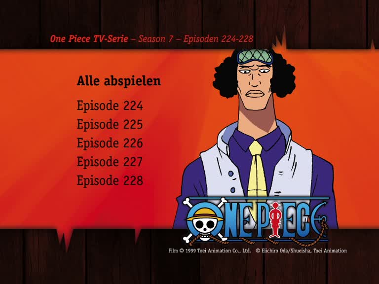 Alle sechs DVD befinden sich in einer Verpackung mit Schuber. Auf dem Cover seht ihr Ruffy mit Mitgliedern der Foxy Piratenbande im Hintergrund. Die komplette Verpackung ist in Rot gehalten. Zieht ihr die Verpackung aus dem Schuber, erblickt ihr Ruffy und Chopper, genau wie sie an den Wettstreiten teilgenommen haben.