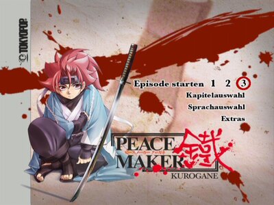 Wenn man die Hülle aufklappt, fällt einem sofort das Booklet ins Auge, das sich wie folgt zusammensetzt: Eine größere Postkarte (18 cm x 13 cm), ein 8-seitiges Heft und ein Infoblatt zu der Robofische-Aktion. Das Motiv der Postkarte zeigt Oktia, Hijikata und Tetsu, während hingegen das Booklet mehrere Screenshots, Inhaltszusammenfassungen zu den drei Folgen, eine Charakterbeschreibung mit vielen kleinen Bildern von Tetsunosuke und eine Werbung zum gleichnamigen Manga bereithält. Auf der DVD selbst gibt es diesmal viel zu ergründen: „Mehr über Tetsu" (ca 1:18 min. Film über die Ziele/Vergangenheit/Gedankengänge des Jugendlichen), Galerie (ca. 1:27 Minuten durchgehender Film mit vielen Charakterskizzen sowie Gruppenbildern), Original Opener und Ending (beide auf Jap.), TV-Spots 1-3, Deutsche Produktions-Credits, Der PEACE MAKER Manga und ein Verweis auf die Tokyopop-Website.