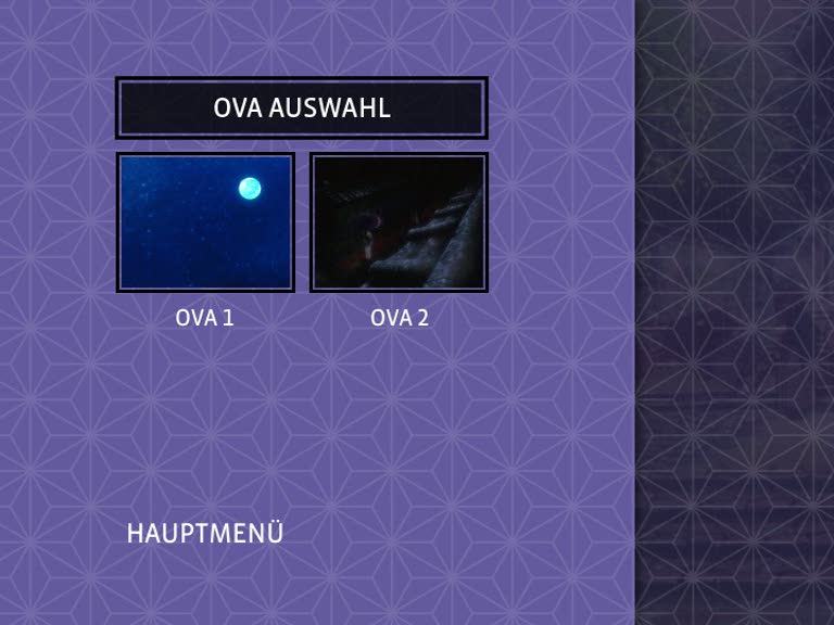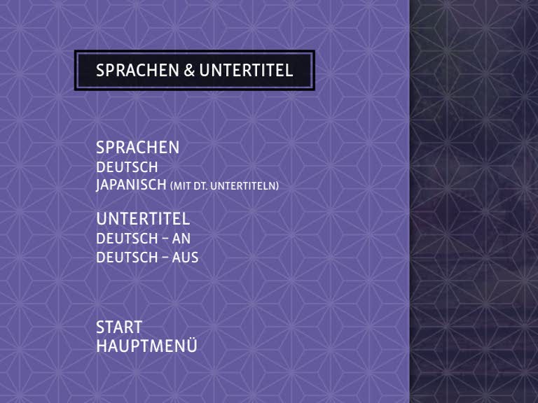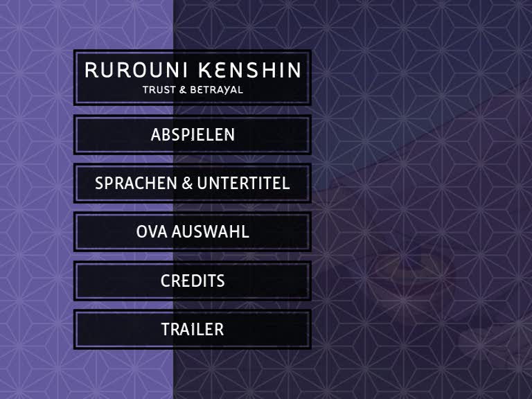 Die DVD kommt in einem schönen Schuber daher, auf dem Kenshin mit Tomoe im Arm abgebildet ist. Ein schwarz-weißer Rahmen lässt das Cover sehr edel wirken. Auf der Rückseite gibt es die Inhaltsangabe, drei Screenshots und wichtige Daten zur Ausstattung. Nimmt man die DVD nun aus dem Schuber, sieht man den leidenden, blutverschmierten Kenshin, Tomoe sowie zwei gekreuzte Schwerter und ausgedünntes Blut. Es macht deutlich, dass die DVD kein Zuckerschlecken wird und es sich um einen harten Inhalt handelt. Klappt man die DVD nun auf, sieht man die zwei weißen Discs mit dem fliederfarbenen Muster, welches auch den Menü-Hintergrund ziert. Auf der linken Seite befindet sich eine Tasche, in der das Booklet und Kazé-Werbung stecken.