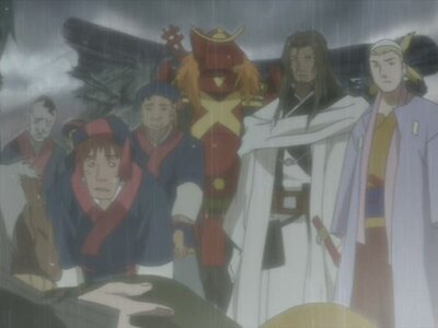 Und so folgen den beiden noch Kirara und Komachi. Herrn Kanbei werden wohl die Shikimoribitu nicht helfen, da sie Handel mit beiden Parteien betreiben: Mit den Samurai und den Banditen. Inzwischen hat sich der Sohn des Kaisers, Ukyo, ebenfalls in die Hauptstadt begeben. Zuvor hat er alle geknechteten Samurai seines Vaters freigegeben, um es dem Dorfe Kanna gleich zu tun. Jeder spricht von der Heldentat der Samurai. Nun findet man auch Nutzen für die übergebliebenen Samurai aus Kriegstagen. Die bewachen nun die Dörfer wegen der Banditen. Um in die Hauptstadt zu gelangen und dem Himmelsherren vorgeführt zu werden, hat sich Kanbei an die Shikimoribitu verkauft. Diese bringen ihn sofort in die Hauptstadt. Dort wird er vom Himmelsherren verhört. Kanbei greift ihn an und rammt sein Schwert in die Glaswand vom Himmelsherren. Doch er wird von der Frau Rikichis angefleht, ihn nicht umzubringen. Die glaubt an den Herren und trägt sogar den zukünftigen Sohn des Himmelsherren in sich. Sie will nicht, dass er stirbt, denn sie liebt ihn. Entsetzt von dieser Entscheidung von Sanae lässt er ab und lässt sich gefangen nehmen.