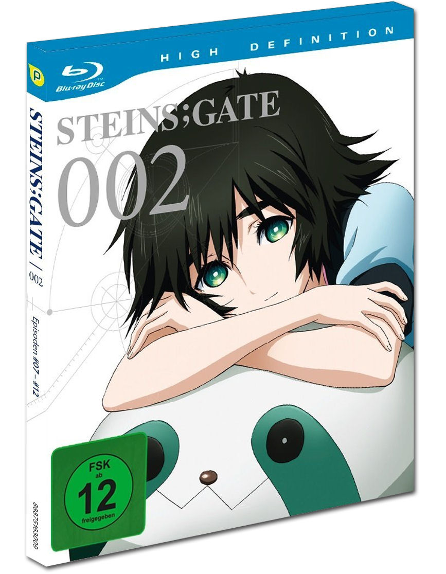 Die Blu Ray ist zweifach eingepackt: Eine aufklappbare Verpackung, in der die Blu Ray liegt, wird in einen Pappschuber geschoben, auf dem Mayuri groß zu sehen ist. Die aufklappbare Verpackung ziert die Zeitreisende Suzuya auf der Vorderseite und auf der Rückseite das Steins;Gate Logo mit einer großen „002“ darunter. Alles ist sehr schlicht in weiß-grau gehalten, bis auf die Figuren. Auf dem Pappschuber sind auf der Rückseite ein Klappentext und ein paar weiß verschleierte Screenshots aus der Serie zu sehen.