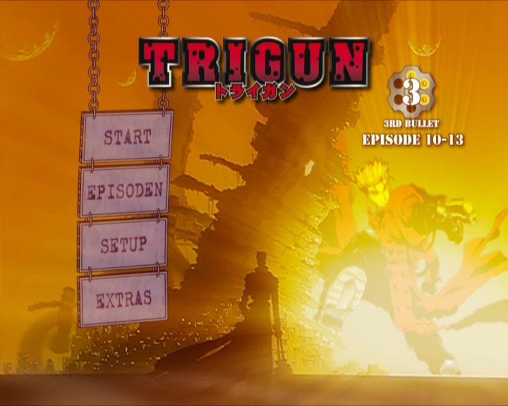 Im gewohnten „Trigun-Design" ist die Rückseite des Schubers mit acht Screenshots, einer kleinen Inhaltsangabe und allgemeinen Infos (z. B. Sprachen, Untertitel, Dauer) bestückt. Das Pack ansich besitzt den gleichen Aufmacher wie das Frontcover – Vash, Meryl sowie Milly. Des Weiteren ist ein Booklet enthalten. Zusammenfassend eine recht ansprechendes Verpackung, die bereits auf den ersten Blick auf Action und Humor hinweist.