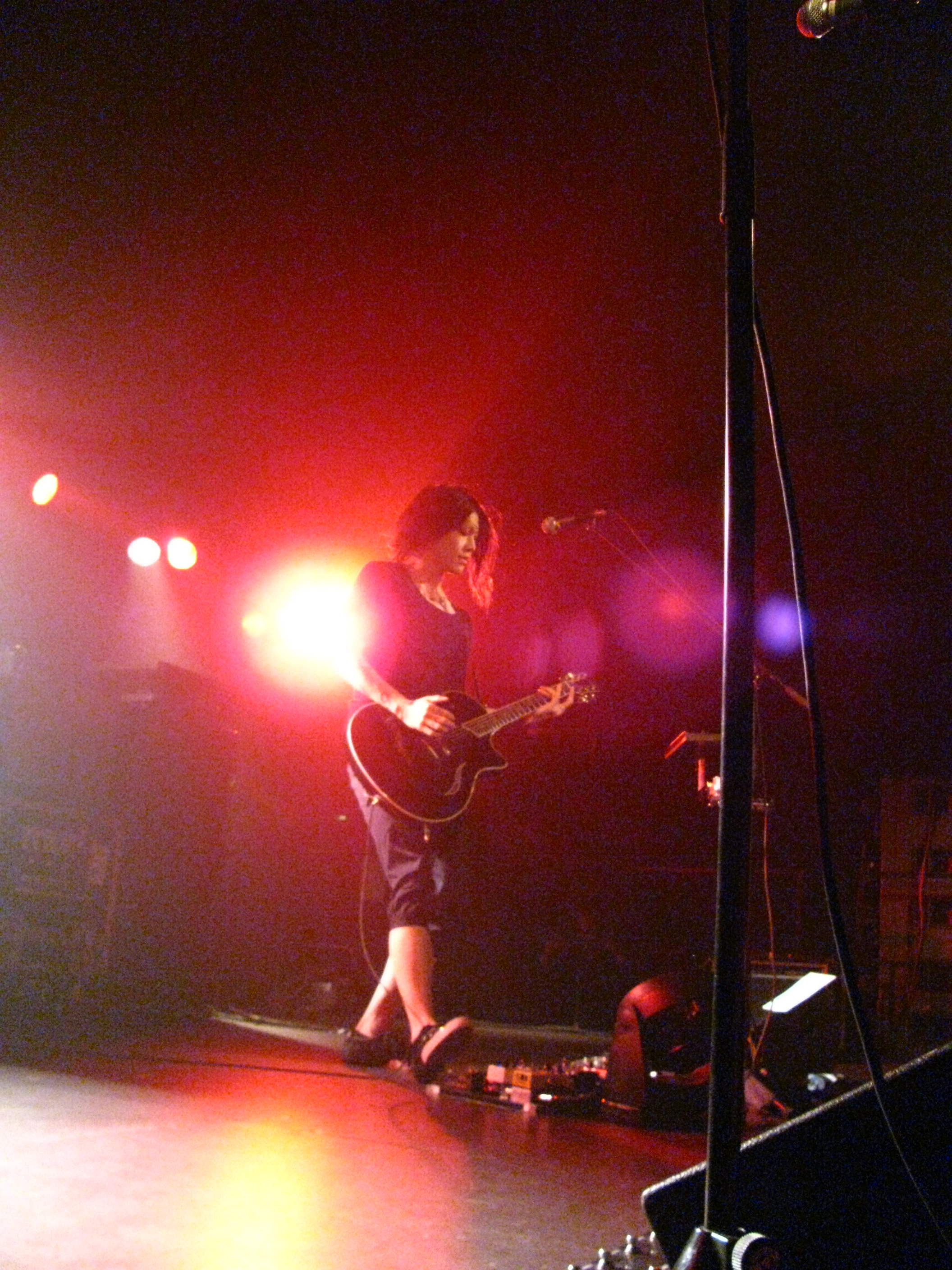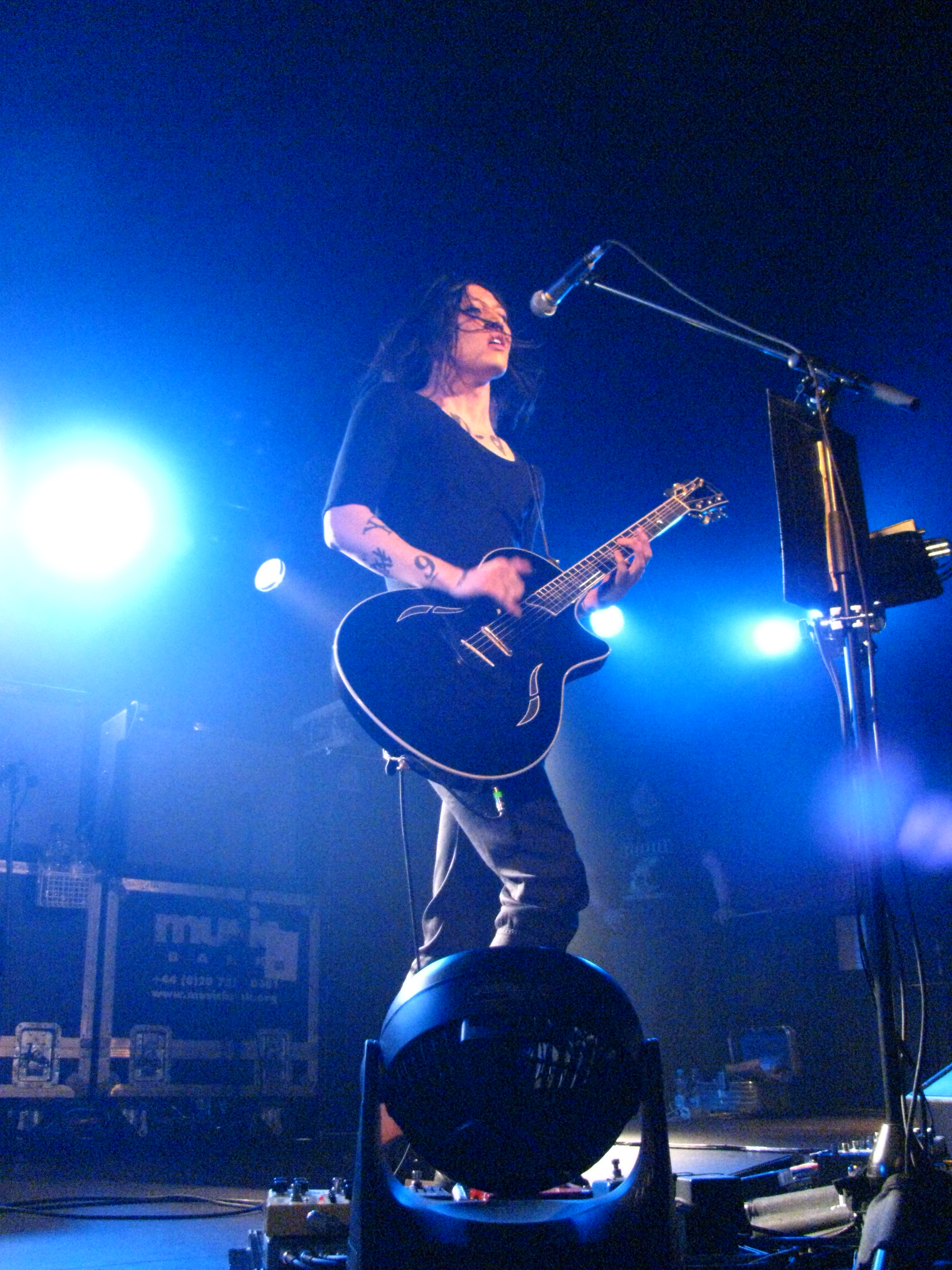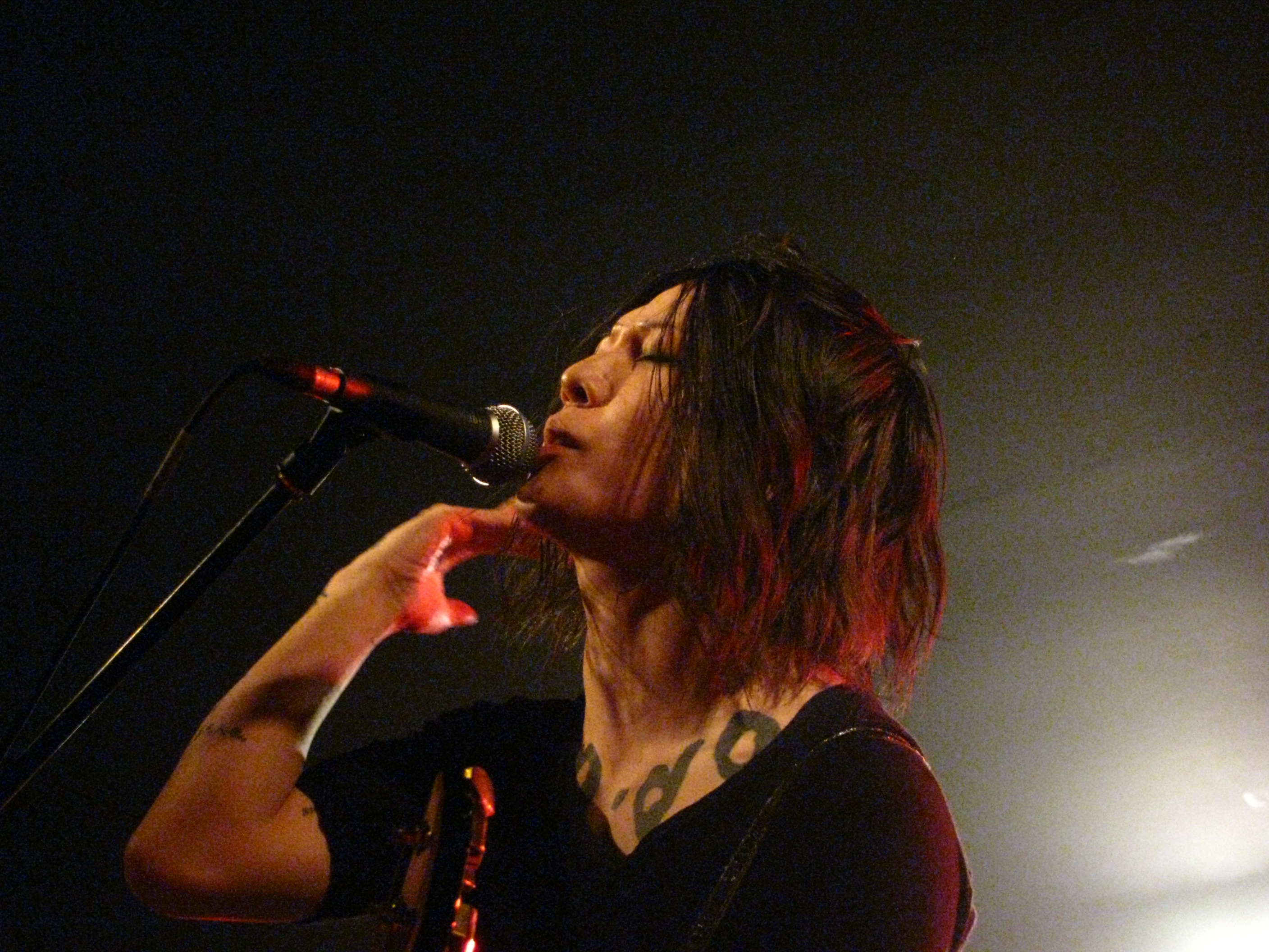 Wer Miyavi kennt, weiß, dass er seine Gitarre spielt wie kein Zweiter und das bewies er den Ungläubigen auch von der ersten Minute an. Er sang sich die Seele aus dem Leib, hüpfte über die Bühne, spielte seine Gitarre auf dem Boden, hinter seinem Kopf und in der Luft. Interessant war dabei vor allem, dass sein gesamtes Konzert nur aus ihm an der Gitarre und an dem Mikrofon und einem Schlagzeuger bestand. Es gab also keine zweite Gitarre, kein Keyboard, nichts. Und doch brachte er mehr Stimmung in den Saal, als so manche Rockband es könnte. Endlich ergaben auch die fünf Mikrofone einen Sinn. Da er kein Künstler ist, der seine Performance auf einer einzigen Stelle der Bühne ausleben kann und unglaublich viel mit seinen Fans interagiert, sieht man ihn immer wieder an anderen Stellen auf der Bühne stehen, singen und spielen.