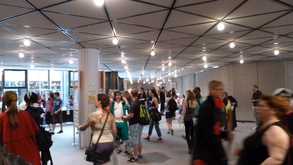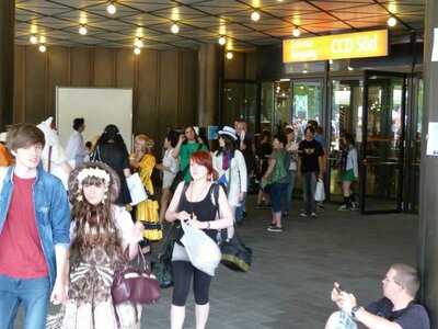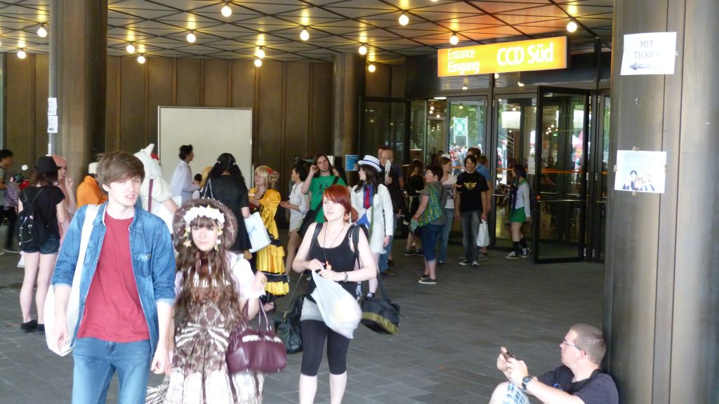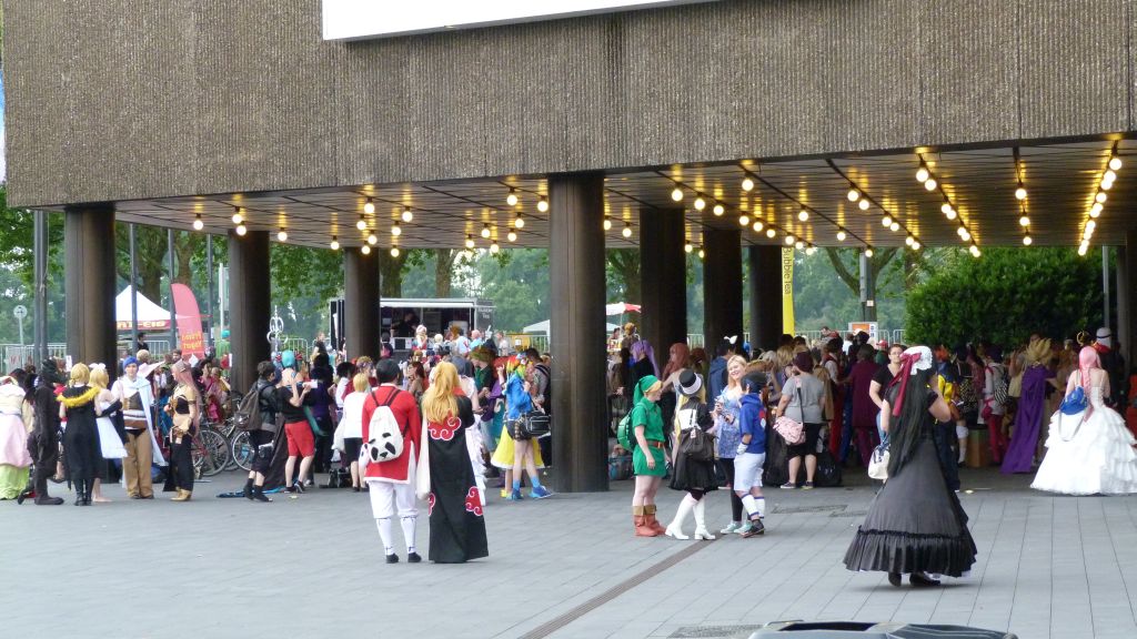 Wieder einmal meinte es der Wettergott gut mit der Convention, die jedes Jahr aufs Neue erstaunt. Die Sonne zeigte sich am Samstag des Pfingstwochenendes von ihrer besten, wenn auch vielleicht von der zu warmen Seite. So mussten sich gerade Cosplayer in warmen Kostümen vorsehen, dass sie nicht austrocknen und diejenigen in knappen Cosplays, dass sie nicht von der Sonne gebrutzelt wurden. Von diesen hübschen Gestalten waren dieses Jahr wieder sehr viele zu sehen. Mittlerweile ist es nicht mehr übertrieben, wenn man sagt, dass der größte Teil der Besucher zu mehr oder weniger kostümierten Gästen zählt. Egal ob innen oder vor einem der beiden Eingänge in das moderne und auffällige Gebäude des Congress Centrum Düsseldorfs, in dem die Veranstaltung stattfand, überall gab es etwas zu sehen und zu fotografieren. Das ist direkt einen der wichtigen Punkte, der sich im Normalfall durch die ganze DoKomi zieht: die familiäre Atmosphäre und die sozialen Kontakte, die geknüpft werden können. Denn bereits am Eingang wurden Gruppen gebildet oder man unterhielt sich im Schatten des Vordachs mit „Charakteren“, die man sehr mag, über gleiche Hobbies. Selbst Mütter und Töchter in Cosplay mit grinsenden Vätern im Schlepptau konnten wir mehr als einmal entdecken.