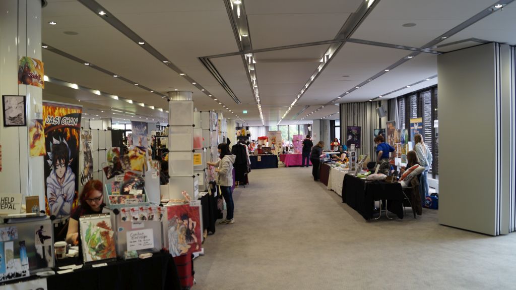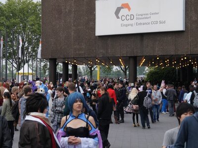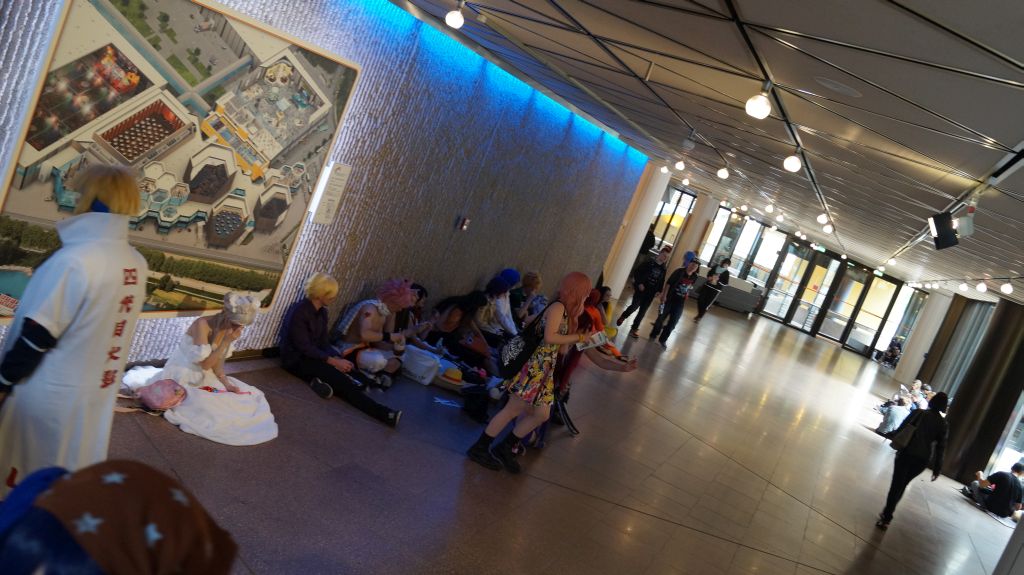 Tatsächlich erstaunte sie die das Düsseldorfer Congress Center das zwar innen ein wenig unübersichtlich sein kann, jedoch schöne helle Gänge und trotz der vielen Menschen noch genug Platz zu Laufen bietet. Auch der Innenhof in dem Raucher eine Pause machen können, ohne das Gelände verlassen zu müssen. Auch die Lage direkt neben den Nordpark und Rhein und das recht weitläufige Gelände sind eine schöne Abwechslung zu anderen Cons. Und das man immer wieder gratis Wasserspender findet zeigt, dass man sich auch Gedanken um die Gäste macht.