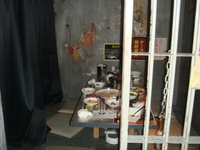 Okay, ich gebe es zu, im Alcatraz-Restaurant gibt es keine Ketten, aber Handschellen sehr wohl. Und mit diesen wird man an seine Begleitung gefesselt und dann darf man in einer Zelle Platz nehmen. Die Japaner sind es gewohnt auf dem Boden zu sitzen, und so gibt es hier auch einen Tisch und Sitzkissen, auf denen Platz genommen wird, aber ansonsten gibt es keine Einrichtung oder Dekorationen. Die Wände sind kahl, die Räume eng und eine Gittertür verhindert die Flucht.