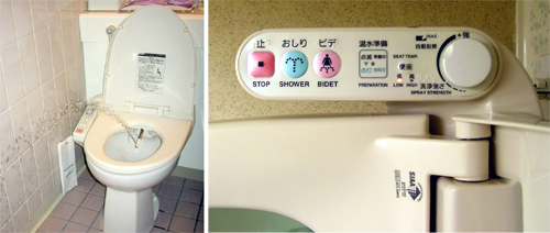 Aber das ist noch nicht alles. Neben beheizten Klobrillen warten moderne japanische Toiletten nicht nur mit einer nötigen Klospülung auf, sondern auch mit der Wahl sich selbst „spülen“ zu lassen. Hier gibt es einen Schalter für den „Oshiri“, richtig, das ist das Hinterteil, und einem Schalter für den Bereich weiter vorne. Es ist dringend zu empfehlen, vorher die Stärke des Wasserstrahls einzustellen! Die Massagefunktion, also die Erweiterung oder Verringerung des Strahls, ist hingegen nicht so wichtig. Das Wasser hierfür ist übrigens vorgeheizt, also keine Sorge.