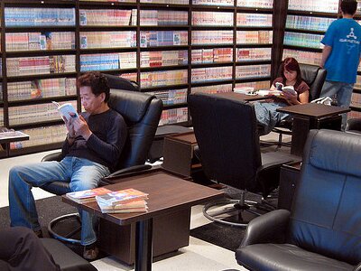 Mittlerweile sind sie auch hierzulande jedem Mangafan bekannt. Die Idee solcher Cafés kam erstmals in den 1970er Jahren auf, als das Angebot in einem der Kaffeehäuser (japanische Abkürzung für "Kissa") erweitert wurde. Für einen abwechslungsreicheren Aufenthalt konnten die Besucher nämlich neben einer Tasse Kaffee auch aus dem dortigen Vorrat Manga lesen. Gut zwanzig Jahre später stieg diese Art der Kaffeehäuser bedingt durch die Zunahme der weiteren Multimedia-Angebote rasant an, sodass in Tokyo im Jahr 2000 rund 200 Manga-Cafés existierten.