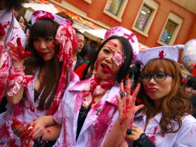 Seither hat Halloween auch in Japan Einzug gehalten. Allerdings ist die Japan-Variante – wie so vieles auf der Insel – etwas anders, als für den europäischen oder amerikanischen Halloween-Fan bekannt: Der Bezug zu Verstorbenen und der jenseitigen Welt, den Halloween ursprünglich innehat, ist in Japan nicht gegeben. Ein Fest, welches dieses Thema behandelt, haben die Japaner längst: „O-bon“. Halloween in Japan ist daher in erster Linie ein großes Verkleidungsfest. Die Frankensteins und Krüppelhexen muss man allerdings mühselig suchen, denn die Verkleidungen sind so vielfältig, wie wir es im deutschsprachigen Raum von den Cosplayern auf zahlreichen Conventions gewohnt sind. Sailor Moon, Miku Hatsune oder Doraemon zu Halloween auf den Straßen anzutreffen ist also völlig normal. Auch mit Feen in Pastell- oder Regenbogentönen muss man rechnen, ebenso wie mit Disney Prinzessinnen. Aber wer fleißig Ausschau hält, findet doch noch die ein oder andere blutige Krankenschwester.