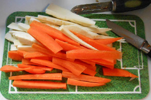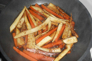 Bei Kinpira wird das Gemüse erst angebraten und dann geköchelt.