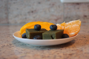 Auch beim Agar gibt es etwas zu beachten: Es wird empfohlen, Agar in Blockform (Ito- oder Kak-Kanten)zu kaufen, oder, wenn das nicht erhältlich ist, zumindest Flocken und kein Pulver zu verwenden. Tatsächlich sind die Yōkan hier mit Pulver sehr fest geworden, eigentlich sollen sie viel weicher sein und nahezu im Mund „zergehen“. Aber trotzdem ist Pulver zumindest in Ordnung.