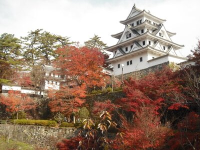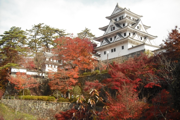 Was in vielen japanischen Burggärten die Kirschbäume sind, sind im Garten der Hachiman-Burg die Ahornbäume: Die Burg selbst wurde ursprünglich 1559 erbaut, in der frühen Meiji-Zeit jedoch zerstört. Erst 1933 kam es zu einem Wiederaufbau. Im Gegensatz zu den meisten rekonstruierten Burgen wurde in diesem Fall Holz statt Beton verwendet. Auf dem Gelände der Burg befinden sich zahlreiche Ahornbäume, deren Laub während der Herbstzeit rot leuchtet. Um diesen Effekt zu unterstreichen, werden sie in den Nachtstunden zusätzlich beleuchtet.