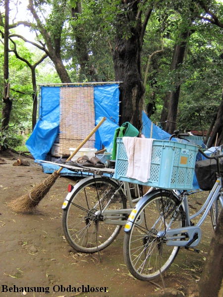 Der Ueno Park ist darüber hinaus aber auch das zu Hause zahlreicher Obdachloser. Sie campieren oft in Gruppen und ihre notdürftigen Behausungen decken sie gerne mit blauen Plastikplanen ab. Die Polizei versucht zwar gelegentlich, diese Notunterkünfte zu zerstören und die Obdachlosen zu vertreiben oder festzunehmen, doch diese kehren nach solchen Aktionen meist schnell wieder in den Park zurück. Im Großen und Ganzen wird ihre Anwesenheit daher geduldet.