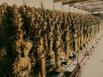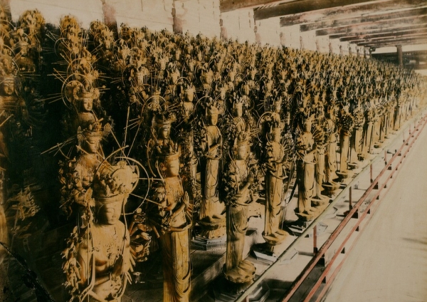 Eines der Kunstwerke, das im direkten Bezug auf Kannon am meisten beeindruckt, befindet sich in Kyoto im Sanjusangen-do, einem buddhistischen Tempel: Hier ruht eine überdimensional große Kannon und ihr zur Seite gestellt wurden 1.000 lebensgroße, tausendarmige und vergoldete Kannons. Der Name des Tempels bezieht sich sowohl auf seine 33 Nischen wie auch auf die 33 Formen, die Kannon annehmen kann. Sein eigentlicher Name lautet jedoch Rengeo-in-hon-do.