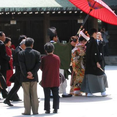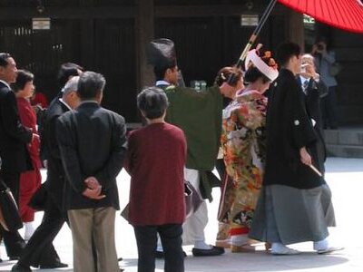 Aber nicht nur für die lieben Kleinen wird an Schreinen gebetet, auch wenn sich zwei Japaner das Ja-Wort geben, wird um göttlichen Beistand gebeten. Allerdings gibt es in Japan noch keine längere Hochzeitstradition. Früher war eine Ehe nämlich nicht verpflichtend und erst mit der Meiji-Zeit, im Jahre 1890, gab es in der Verfassung ein Gesetz, welches die Vielehe verbot und somit das Bedürfnis in den Japanern auslöste, den „Bund der Ehe“ auf religiöse Weise zu zelebrieren. Daher gibt es verschiedene Wege, um eine Ehe zu schließen, zum Beispiel ein eher bescheidenes Hochzeitsritual ("jinzenmae"), eine christliche oder shintōistische Hochzeit. Allerdings heiraten viele japanische Paare auf christliche Weise, da die Trauung billiger ist als eine shintōistische Zeremonie.