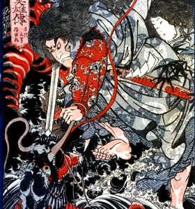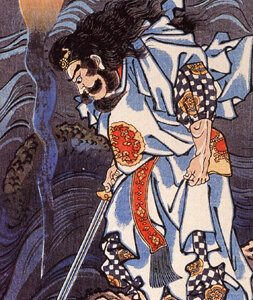 Susanoo ist im Shintoglaube der Sohn der Schöpfergottheit Izanagi. Als dieser sich nach seinem Besuch in der Unterwelt reinigte, entstanden seine drei Kinder, Amaterasu, Tsukuyomi und Susanoo. Wobei der Sturmgott Susanoo durch das Waschen der Nase von Izanagi erschaffen wurde. Izanagi teilte seinem Sohn die Aufgabe zu, über das Meer zu herrschen.