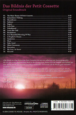 Das „Mysteriöse" an der Verpackung ist, dass es auf den ersten Blick nicht wie eine CD aussieht. Der Soundtrack ist in eine normale transparente DVD-Hülle gepackt worden, dessen Cover die kleine Lolita Cossette in weinroten, violetten Farben sitzend ziert. Das einzige, was darauf hinweist, dass es sich um eine CD und nicht um eine DVD handelt, ist die Aufschrift „Original Soundtrack".