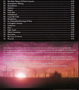 Ein Abspiel von den unterschiedlichsten Klängen, die beruhigend als auch aufbrausend ausfallen können. Allerdings ist bei jedem Lied die dramatische Grundstimmung wohl kaum zu überhören, die passend zum Anime komponiert wurde. Meine Empfehlung gilt den Fans dieser Lolita-Serie und denjenigen, die sich mit dieser Art von Musik anfreunden können. Wer sich hierfür nicht begeistern kann, wird mit Das Bildnis der Petit Cossette wohl einen „Bauchplatscher" hinlegen.