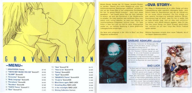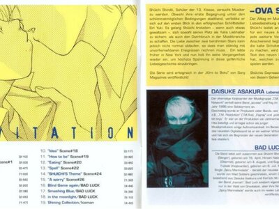 Die blassblaue CD erscheint uns zunächst eher unauffällig und reichlich monoton, auch wenn die Artworks von Maki Murakami, die u.a. auch das gesamte Booklet zieren, sehr dynamisch und serientypisch wirken. Auf dem gestreiften Cover finden sich die beiden Hauptprotagonisten Shuichi Shindô und Yuki Eiri. Neben dem Logo finden wir auch einen blau geschriebenen und damit etwas im Hintergrund liegenden Einleitungstext zur Serie, der uns in englischer Sprache präsentiert wird.