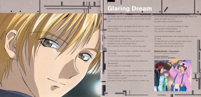 Lyrics gibt es zu den TV-Serien-Songs "SUPER DRIVE", dem Opening, "Glaring Dream", dem Ending, "Sleepless Beauty", Insert-Song von Nittle Grasper und "THE RAGE BEAT", Insert-Song von Bad Luck. Diese Titel werden von Screenshots zur Serie begleitet und auch ganzseitige Illustrationen von Shuichi, Yuki und Hiro finden wir vor. Des Weiteren befindet sich im Booklet gleich auf der zweiten Seite eine Infobox mit dem knapp umrissenen Inhalt der 13-teiligen TV-Serie und zu Daisuke Asakura, der hinter dem "Projekt" Bad Luck steht. Auf der letzten Seite im Booklet finden wir den Soundtrack und Animationsstaff vor.