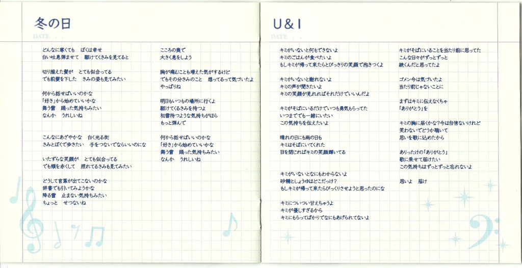 Jede Seite wird von einem Songtext gefüllt. Da es sich hier um eine japanische Import-CD handelt, sind die Texte natürlich nur in japanischer Sprache und Schrift abgedruckt. Am Ende gibt es noch eine Auflistung der Beteiligten, bei der man auch genau sieht, welche Songs auf beiden und welche nur auf einer CD zu finden sind.