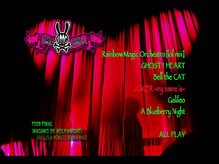 Das eigentliche Extra ist hier die DVD. Auf dieser könnt ihr euch die Live-Performance einiger Songs des Winterkonzerts [Nagano de HOLY☆Night] vom 25.12.2009 in der Hokuto Bunka Hall ansehen. Dabei handelt es sich um die Lieder „Rainbow Magic Orchestra [lol mix]“, „Ghost†Heart“, „Bell the CAT“, „JOKER –my name is-“, „Galileo“ und „A Blueberry Night“. Insgesamt bekommt man hier eine Laufzeit von etwa 22 Minuten.