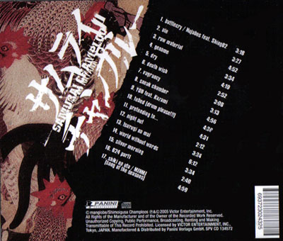 Die linke Seite der Rückseite ist mit japanischen Hähnen verziert, die ineinander übergehen, während auf der rechten Bildhälfte ein gellendes Schwarz regiert, auf dem in weißer Schrift die 17 Tracks zu lesen sind. Allgemeine Angaben wie Hersteller sowie Copyright sind hier ebenfalls nachzulesen.