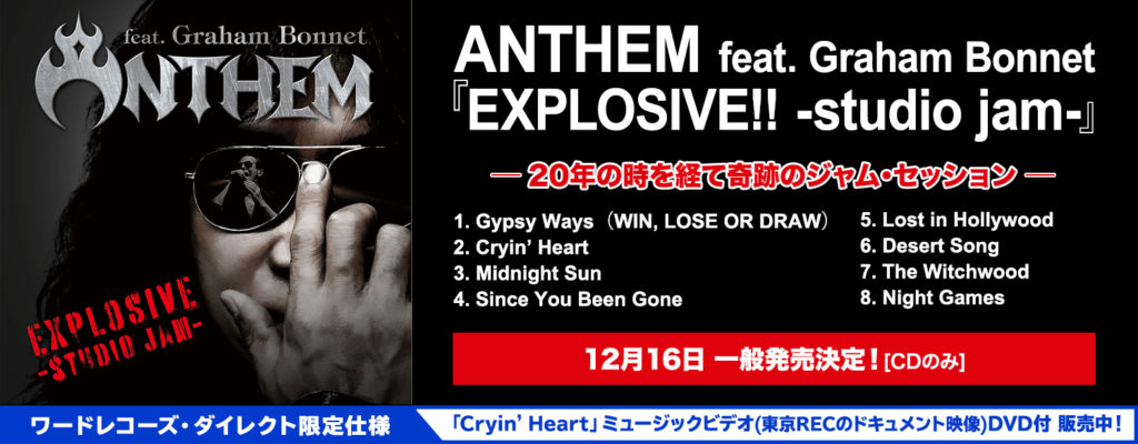 Am 16.12.2020 erscheint das neue Album "EXPLOSIVE!! -studio jam-" von ANTHEM, welches sie gemeinsam mit dem Sänger Graham Bonnet aufnahmen. Dieses Album kann bereits für etwa EUR 18,23 bei CDJapan vorbestellt werden.