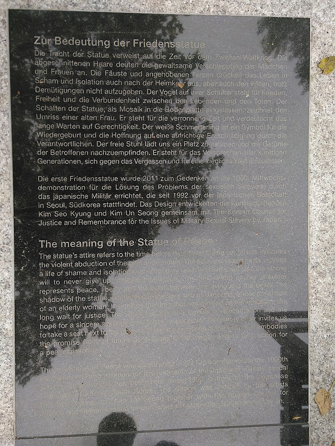 Am 28. September wurde in Berlin Moabit die Statue einer koreanischen „Trostfrau“ (engl. „comfort woman“) enthüllt: Sie steht symbolisch für zehntausende Mädchen und Frauen, die während des Asien-Pazifik-Krieges (1931 – 1945) aus verschiedenen Ländern, vermehrt aber aus Korea und China, vom japanischen Militär unter falschen Versprechungen herausgelockt und in Kriegsbordellen zu sexuellen Handlungen gezwungen wurden. Erschaffen wurde die neue Statue vom südkoreanischen Künstlerpaar Seo-Kyong Kim und Un-Seong Kim.